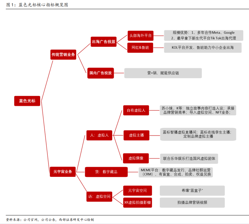 蓝色光标对元宇宙的布局较早,从2021年下半年开始发力,在虚拟人、虚拟物、虚拟场景三条业务赛道,形成了交叉支撑的业务生态全景。