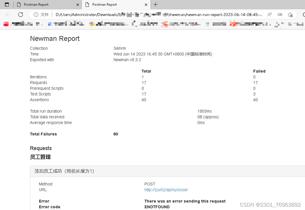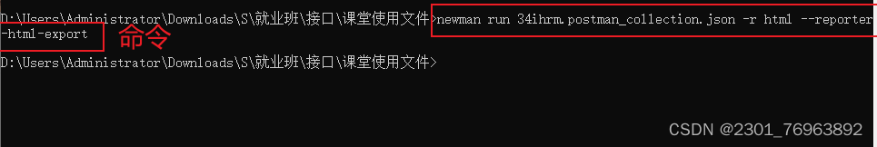 3.输入newman命令:newman run 用例集名称.json -e 环境文件名称.json -r html --reporter-html-export 生成测试报告的路径以及名称.html