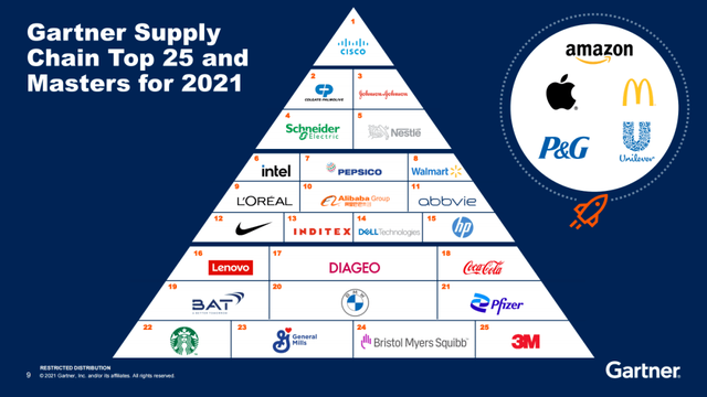 Gartner每年公布的全球供应链榜单,是目前全球范围内的供应链的“天梯榜”。自2013年开始,苹果长期位于榜单前列,还曾连续七年位列得分榜的榜首。在最近三年的榜单中,苹果均位于最高级“超凡大师级”(Master),其他四家均为快消和零售企业,苹果是五家大师级企业中唯一的科技企业。