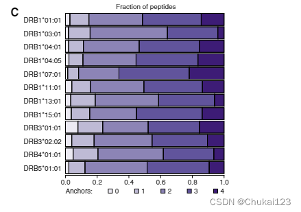 图2C:在(B)中存在的等位基因中,表现出0,1,2,3或4个预期残基的肽的份额。锚定位置被定义为具有最低熵的四个位置,并且“显而易见”的残留物被定义为这些位置中具有>=10%频率的残留物。