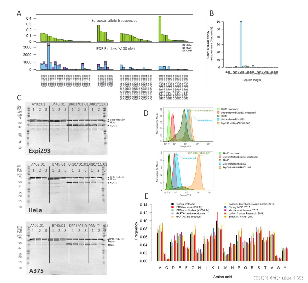 图S1A表示IEDB中欧洲分型的频率分布,图S1B表示IEDB中HLA-II型中不同长度的peptide的亲和力数量,图S1C表示转染方案的比较,图S1D表示HLA细胞表面分析,图S1E表示为MAPTAC和IEDB观察等方案的氨基酸频率。