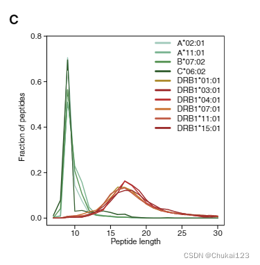 图1C表示选择HLA-I和MAPTAC分布的HLA-II等位基因的肽长度分布。可以看到HLA-I型9长度居多,而MAPTAC生成的HLA-II型肽主要分布在15~20长度。