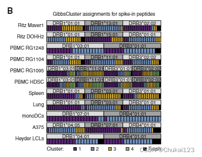 图2B:MAPTAC 肽的聚类分配添加到 pan-DR MS 数据集中。 使用 GibbsCluster 对数据集进行反卷积。 每个彩色框代表一个 MAPTAC 肽的簇分配。