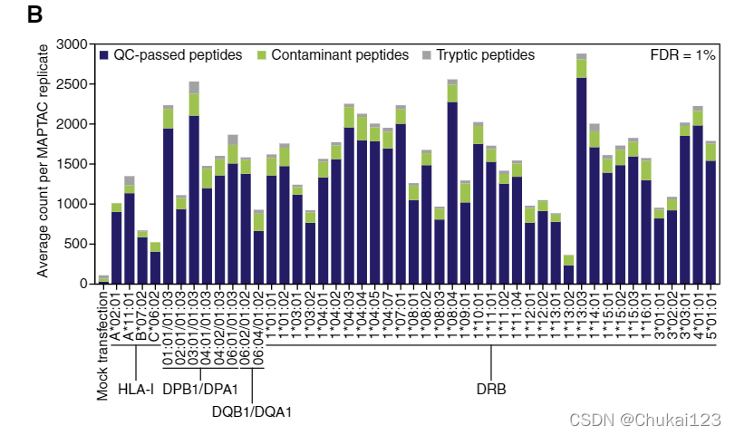 ** 图B的横坐标表示不同的分型allele,纵坐标表示每个 MAPTAC 复制的平均计数,其中包括QC-passed肽,污染肽和胰蛋白肽,采用的FDR=1%**