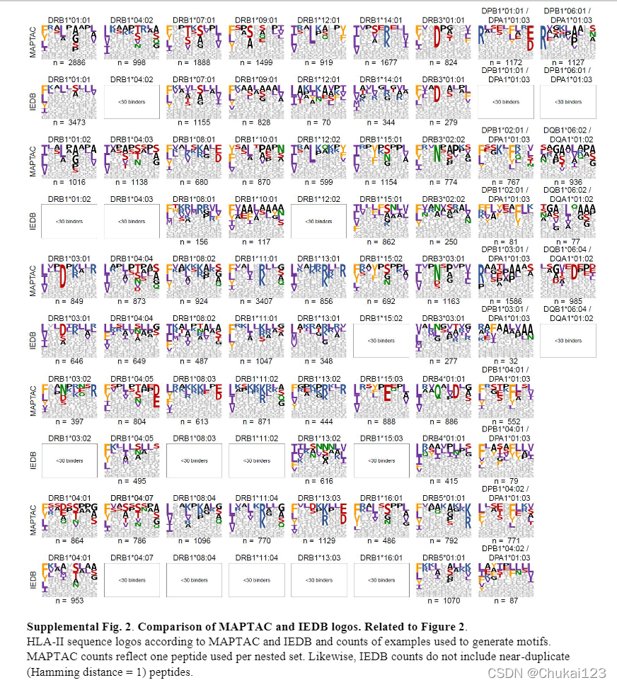 使用 MAPTAC 来解析等位基因特异性 HLA-II 结合基序,其中 15 个以前未被表征(在 IEDB 中 <30 个具有 <100 nM 亲和力的肽),包括非欧洲人群中常见的等位基因(DRB112:02,DRB1 15:03 和 DRB1*04:07)。 对于先前表征的 HLA-II 等位基因,基序(由 GibbsCluster 解决;Andreatta 等人,2017 年)与 IEDB 密切匹配(下图 S2)。