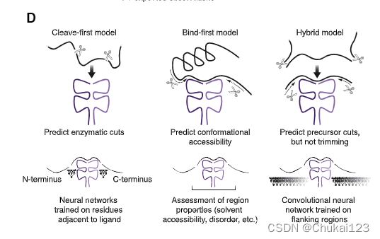 第一个假设内肽酶占主导地位(“先切割”); 第二个模型假设 HLA-II 与随后被外肽酶向内修剪的全长蛋白质结合(“首先结合”); 第三种模型表明酶消化发生在 HLA 结合之前和之后(“混合”)。 每个模型都需要不同的算法方法。 具体来说,由切割优先观点推动的算法应该关注 MS 观察到的配体边缘的氨基酸基序(Paul 等人,2018 年); 然而,由绑定优先观点驱动的算法会更好地忽略这些基序并专注于决定 HLA 结合可及性的局部蛋白质结构特性。 受混合模型启发的算法应该在观察到的 HLA-II 肽的上游和下游寻找候选前体切割位点。