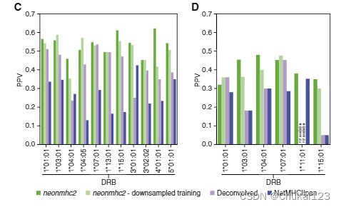 图3C和图3D:NetMHCIIpan 和 CNN 模型的 PPV,在单等位基因 MAPTAC 数据(neonmhc2 - 用和不用下采样)或反卷积多等位基因数据上训练。