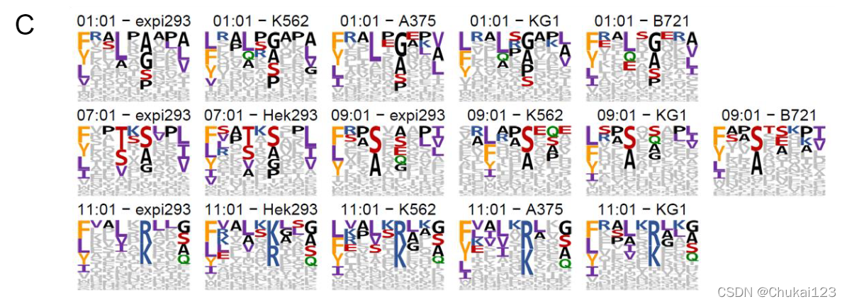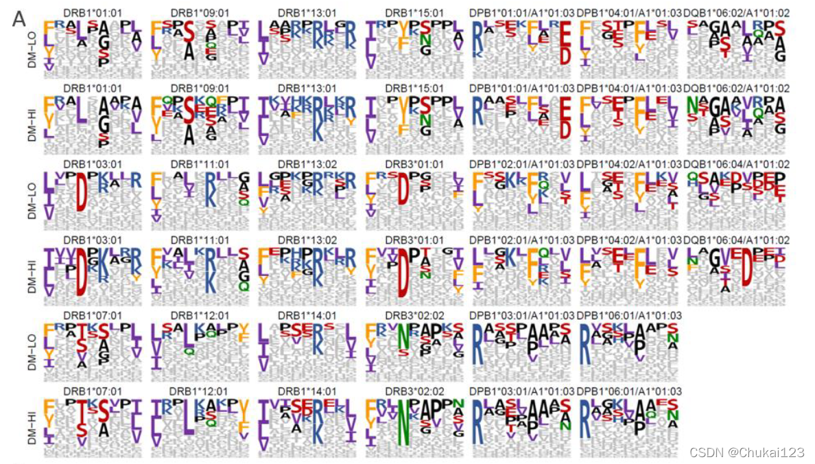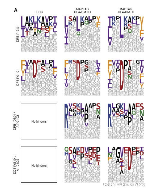 图2A:来自IEDB和MAPTAC的代表性HLA-II等位基因的序列标志在Expi293细胞中,具有和不具有HLA-DM共转染。每个氨基酸的高度与其频率成比例。具有频率> 10%的氨基酸通过化学性质着色。