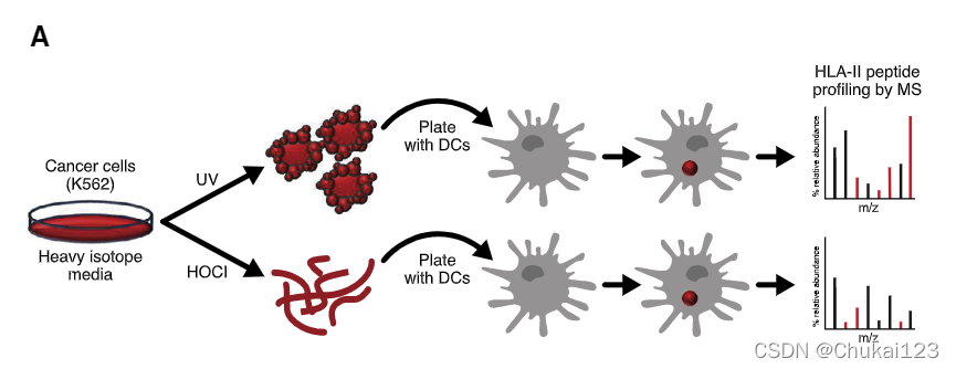 为了标记肿瘤衍生蛋白,我们在含有同位素标记的 L 和 K 的培养基中培养了 HLA-II 缺陷型癌细胞系 (K562),标记效率 > 95%。 DCs 被喂食裂解的肿瘤细胞(以模拟肿瘤碎片的巨胞饮作用)或经紫外线处理的整个肿瘤细胞(以模拟整个细胞的吞噬作用)。 用 MS 分析 HLA-DR 结合肽并区分为重标记或轻标记。 实验分别产生了 29 和 56 个重标记肽用于裂解物和 UV 实验(data S1B)。 除了两种情况外,含有超过一个 L 或 K 的肽在所有情况下都显示完全标记,这表明重标记的肽来源于肿瘤细胞而不是来自新翻译的 DC 蛋白,这将显示不一致的标记。 未经处理的 DCs 和用裂解物孵育 10 分钟后收获的 DCs 均未产生重标记肽。