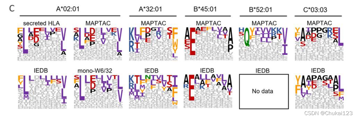 图S4C:根据 MAPTAC 和 IEDB 的几个 HLA-I 等位基因的序列标识。 HLA-A32:01 在 P2 处不显示高频 Q,而 HLA-C03:03 在 P9 处不显示高频 Y,这与之前使用多等位基因反卷积的研究不同 (Bulik-Sullivan 等人 ., 2018; Chong 等人, 2018); HLA-B*52:01 的标志以前没有特征。