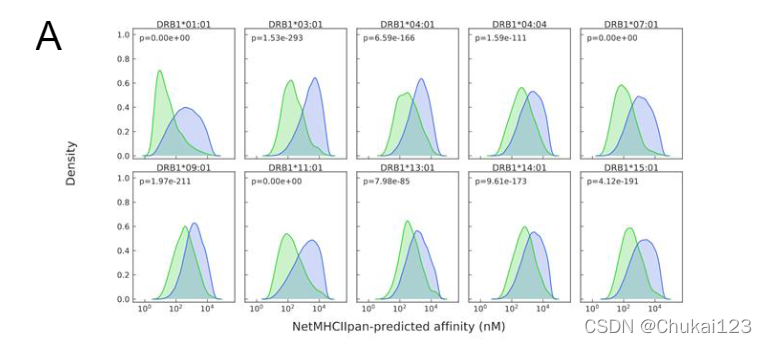 对于 HLA-DP 和 -DQ 等位基因,其特征通常不太好,我们注意到非规范模式,包括 P1 中非疏水残基的存在。 MAPTAC 观察到的肽段并不总是显示常见等位基因的 NetMHCIIpan 得分很高(图 S3A); 图S3A中绿色表示MAPTAC,蓝色表示从蛋白质组中随机取样的。