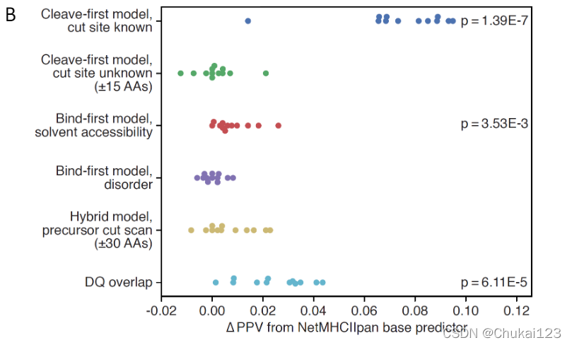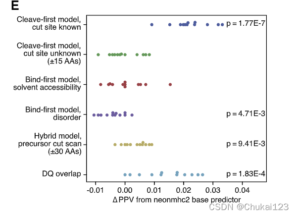 在考虑的三种方法中,只有 cleave-first 算法对基线模型产生了可测量的改进(图 5E 和 S7B)。 然而,这种方法似乎通过学习阳性示例肽中存在的外肽酶修剪标志(例如倒数第二个脯氨酸特征;Barra 等人,2018 年)来“欺骗”,因为如果精确切割它无法增加价值 查询肽的位点被掩盖(STAR 方法)。