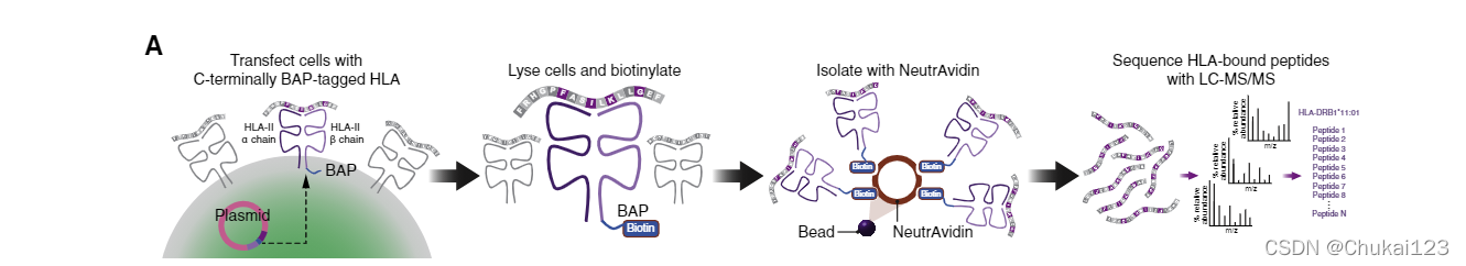 图1A.用 C 末端 BAP 标记的 HLA 转染细胞,并用裂解细胞和生物素进行处理,再用 NeutrAvidin 分离,最后使用 LC-MS/MS 对 HLA 结合肽进行测序;