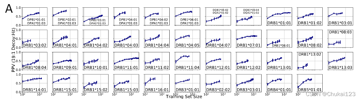为了计算每个等位基因的阳性预测值 (PPV),n 个 MS 观察到的肽与从同一组源基因中采样的 19n 个长度匹配的诱饵以及每个预测因子的 n 个排名靠前的肽(即前 5 %) 被称为阳性。在这种情况下,PPV 与召回相同,因为误报的数量和漏报的数量相等。以 1:19 的hit-to-decoy比例计算 PPV 表明,nenmhc2 在预测 MAPTAC 观察到的肽方面相对于 NetMHCIIpan 改进了 PPV(图 3B)。
