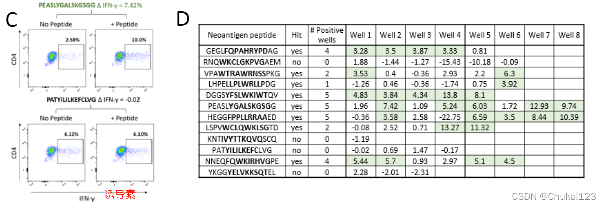 为了评估 neonmhc2 的治疗相关性,我们试图确定 neonmhc2 是否可以在离体诱导试验中鉴定能够引发 CD4+ T 细胞反应的新抗原。专注于 DRB111:01,这是一个常见的等位基因,在 IEDB 中具有许多亲和分析证实的结合物(仅被 DRB101:01 和 DRB1*07:01 超越;图 S1A),我们对一组癌症基因组图谱进行了评分(TCGA) 观察到新抗原序列并选择了 neonmhc2 首选的子集(预测的前 1%)但 NetMHCIIpan 未选择的子集(预测的下 90%)。通过去除可能与诱导材料中存在的其他 HLA-DR 等位基因结合的肽,进一步完善了该组。大多数 neonmhc2 选择的肽 (8/12) 产生 CD4+ T 细胞反应,通过干扰素 (IFN)-g 表达测量,以响应肽的回忆(图 3E、S5C 和 S5D)。这些结果表明,我们经过 MAPTAC 训练的 neonmhc2 可以识别 NetMHCIIpan 未识别的免疫原性 HLA-II 新抗原序列。