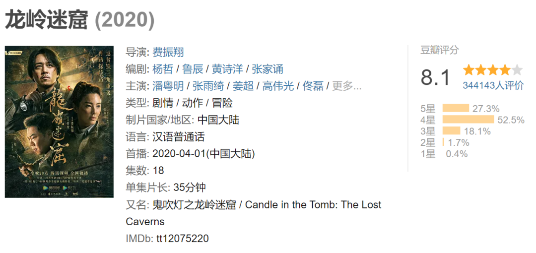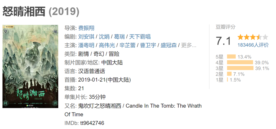 而在网剧方面,同时期内,付费模式的开启加速了更多平台和创作者入场,新的商业模式被验证,平台对自制内容的投入也迅速加码。后来企鹅影视投拍“鬼吹灯”系列网剧,单集投资额便达到500万的规模。也是因此,高投入和优质团队入场,相较同类内容,“鬼吹灯”IP中更快走出了高品质的作品,早期的《寻龙诀》豆瓣评分便达到7.4分,《精绝古城》的出现也一改市场对同类内容粗制滥造的印象。