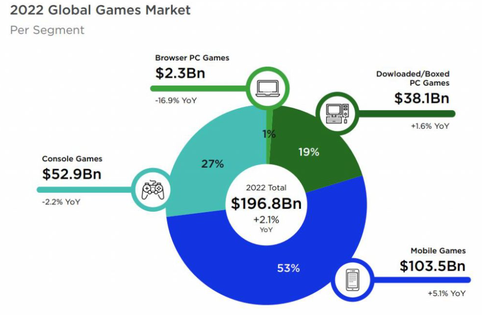 根据New ZOON《2022年游戏市场报告》,全球移动端游戏消费产值为922亿美元,主机游戏市场为512亿美元,而PC游戏市场总产值只有405亿美元。
