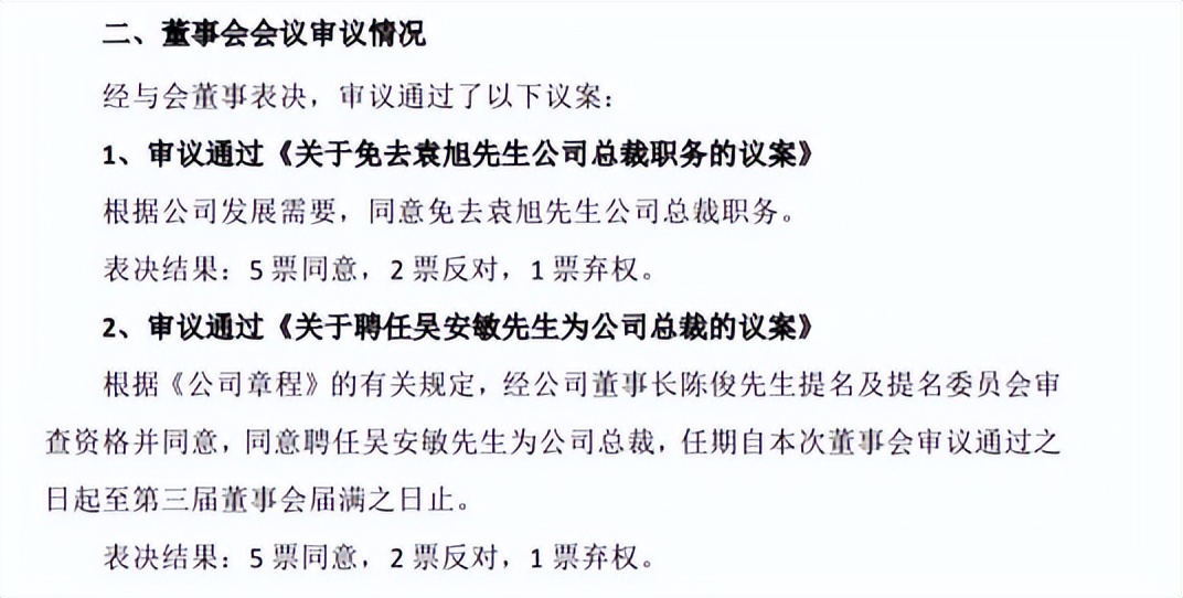 关于新总裁聘任的议案,以袁旭、张云帆寡不敌众反对无效而告终,结果基本已成定局。