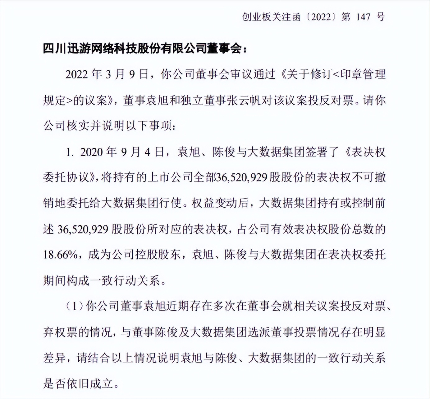 从2022年开始,总裁袁旭和董事张云帆两人在董事会议案中多次唱反调,并且表现也很消极:弃权、反对、乃至回避表决。深交所也在今年3月份发出了关注函,要求迅游科技对其股东“一致行动关系 ”及“公司控制权是否稳定”做出回复。
