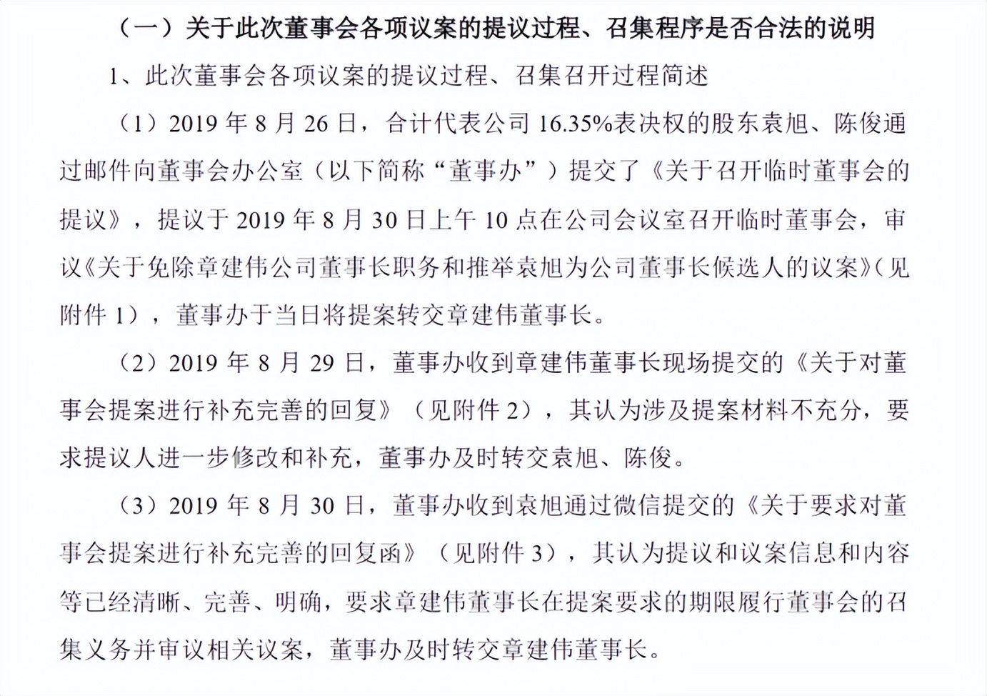 或许正是债务纠纷添上的一把火,反击来得很快。8月底袁旭与陈俊二人以“缺乏对公司所处行业、发展战略、主营业务的理解,长期缺席公司战略制定和日常经营管理”为由,向董事会提议免除章建伟的董事长职务,同时提议袁旭兼任。