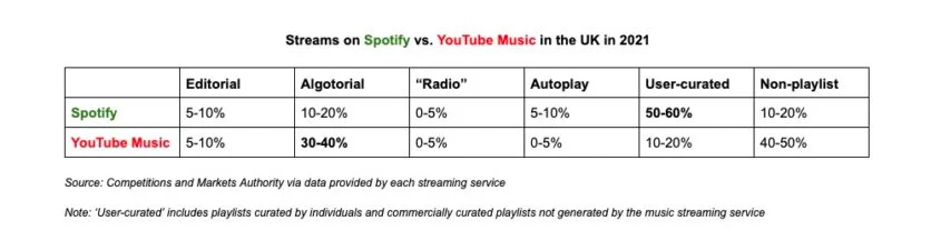 据英国竞争和市场管理局(Competition and Markets Authority,CMA)在去年对音乐流媒体进行调查后公布的报告显示,2021年,英国Spotify上只有10%-20%的播放量是Spotify根据用户喜好进行的算法推荐,50%-60%的播放量都来自用户自己创建的歌单,还有10%-20%是用户通过搜索等主动的方式播放的音乐。
