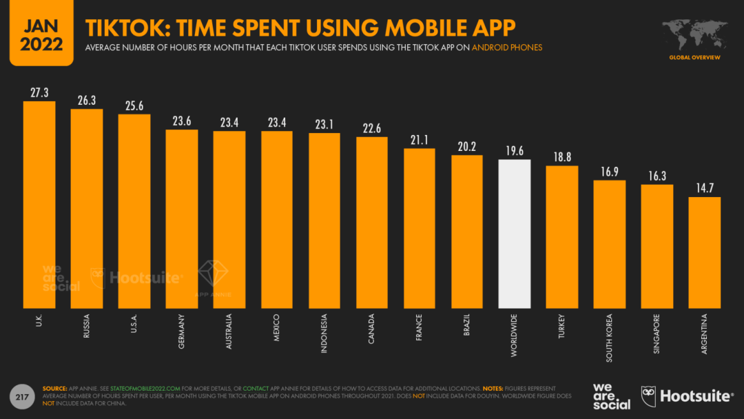 2021年3月,TikTok在英国已拥有超过1390万活跃用户,超过英国人口总数的1/5。2022年1月,英国用户在TikTok上花费的平均时长为每月27.3小时,位居全球TikTok使用时间榜首。