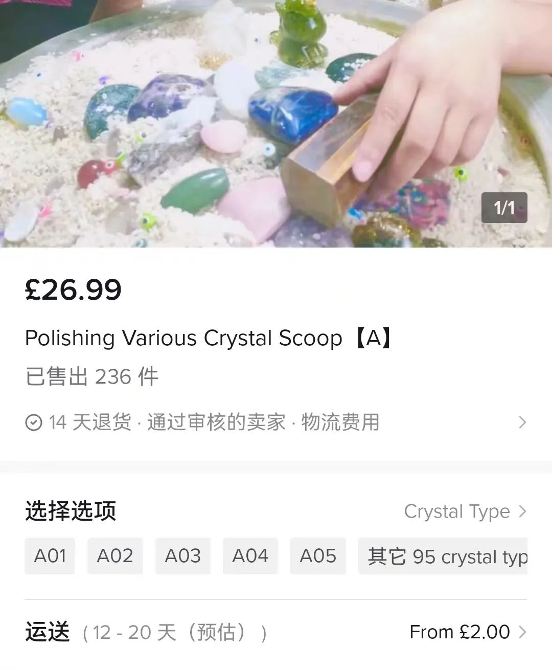 比如,在TikTok上卖得最火爆、直播频次最高的水晶石,被英国人奉为“幸运的宝物”。为了提升“带来好运”的仪式感,很多人希望主播在直播间现场随机抽取一把幸运石,再亲眼见证装袋的过程。但这意味着,消费者在12~20天后才能收到货。