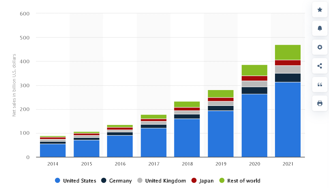 2014 年至 2021 年亚马逊在主要市场的年净销售额 图源:Statista