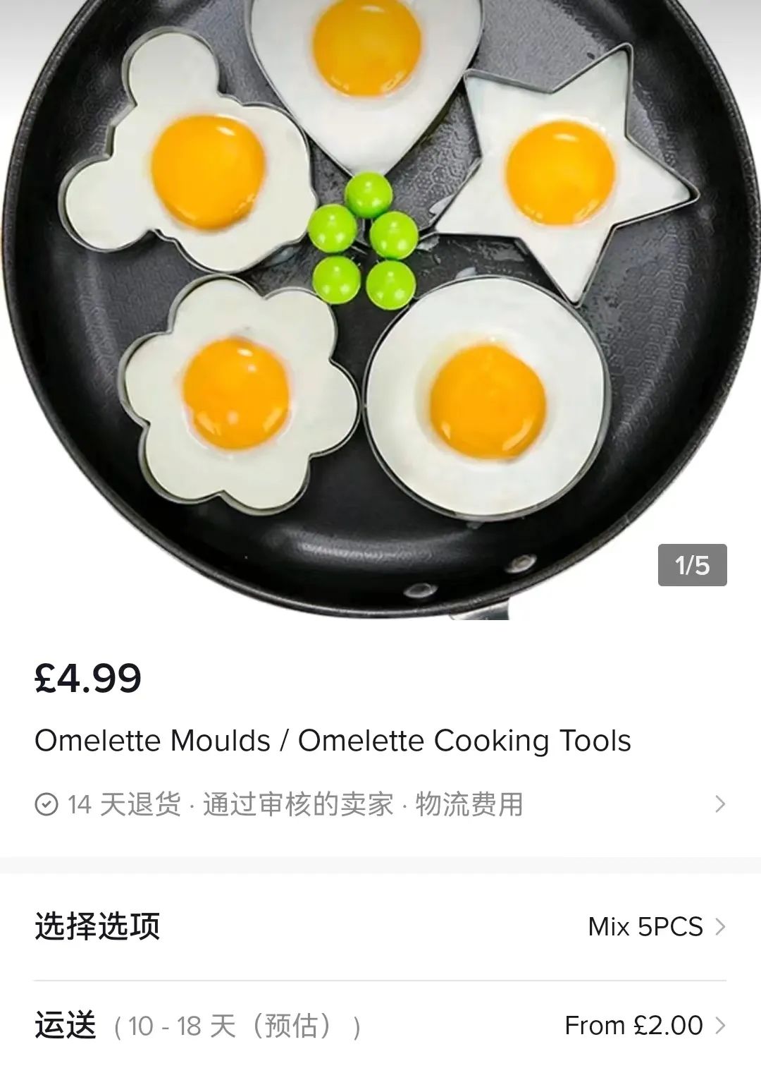 英国市场商品定价很高,同样产品的价格比国内贵很多倍。以TikTok上一组普通的煎鸡蛋模具为例,售价加运费大约56元人民币,但在国内电商平台上只需10元左右,且很多卖家提供包邮服务。