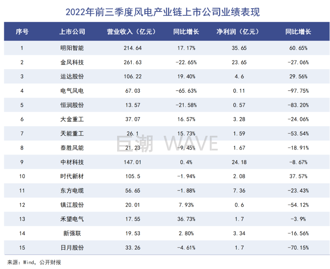 从已公布的2022年前三季度业绩来看,风电产业链的上市公司,从铸件、塔筒、叶片到整机,绝大多数营收和净利润均双双下滑,能实现利润增长的企业屈指可数。