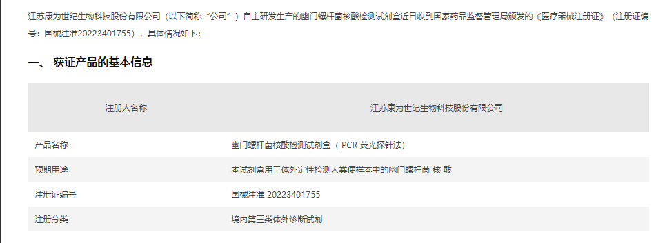 近期,康为世纪迎来一则利好。康为世纪发布公告显示,公司自主研发生产的幽门螺杆菌核酸检测试剂盒近日获国家药品监督管理局颁发的《医疗器械注册证》(注册证编号:国械注准20223401755),该幽门螺杆菌核酸检测试剂盒(PCR荧光探针法)用于体外定性检测人粪便样本中的幽门螺杆菌核酸,用于幽门螺杆菌感染的辅助诊断。
