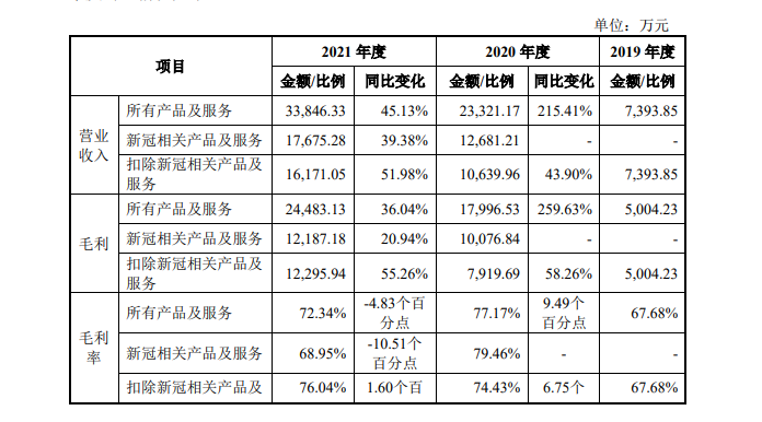 康为世纪上市背后,主要得益于核酸检测业务收入猛增。招股书显示,2020年、2021年,康为世纪实现的营业收入分别为2.33亿元、3.39亿元,对应实现的净利润分别约1.09亿元、1.26亿元。其中来自新冠相关产品及服务收入金额分别为1.27亿元和1.77亿元,如扣除新冠相关产品及服务收入,前述报告期实现的营业收入金额分别为1.06亿元、1.62亿元。