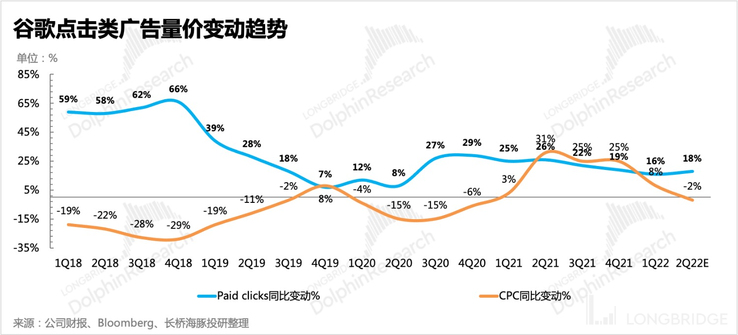 上季度谷歌的 CPC 报价的增速已经相比投放量更加放缓,虽然业绩快报中不披露广告单价与投放量指标(后续完整财报会披露),但如果从上季度的趋势,以及参考 Cowen 的专家调研(仅代表专家所在广告代理机构的投放情况)——二季度他们观察到 CPC 报价增速相比一季度进一步放缓,市场对谷歌 CPC 的预期直接已经从一季度的 8% 增长调整至同比下滑 2%,说明经济需求确实表现出了边际疲软的趋势。