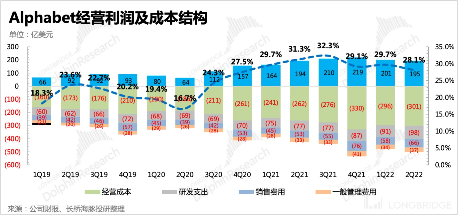 首先纵观 Alphabet 的整体业绩,收入表现比市场这两天的悲观预期要好,利润上相比一致预期略有差距,并且由于去年的高基数,几乎没有增长。问题主要在费用支出上,使得谷歌互联网服务和谷歌云两项业务的经营利润率均同比去年有所下滑。从费用类别来看,在收入增长放缓下,研发费用的支出还在加速。