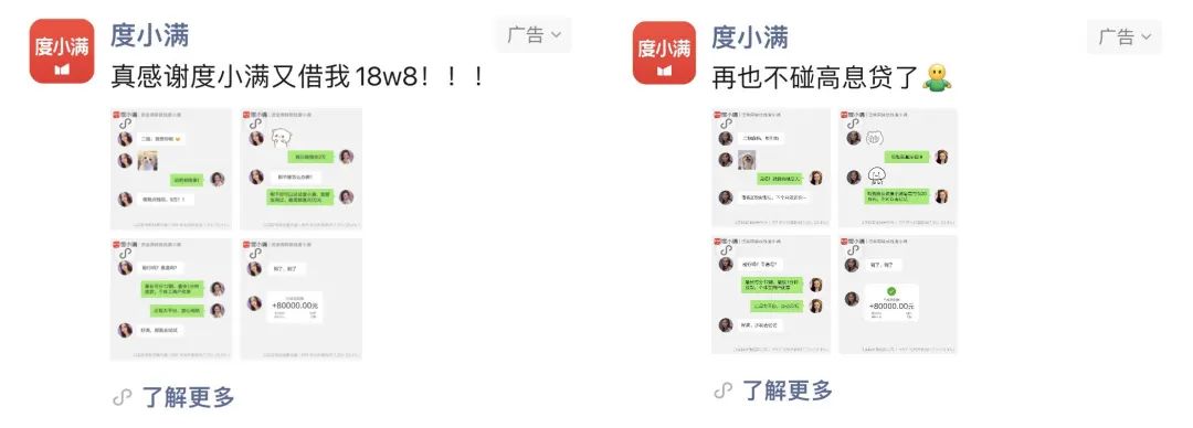 “真感谢度小满又借我18W8!!!”“再也不碰高息贷了”,近期,度小满的信息流广告出现在了很多人的朋友圈时间线上,这些用词较为夸张,诱导性和冲击力都极强的广告,点击后都直接跳转到了“有钱花·借钱”界面。
