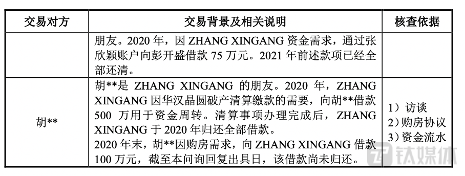 相关收支情况还显示,2020年,张欣刚因华汉晶源清算缴款需要,向胡某某借款500 万用于资金周转。