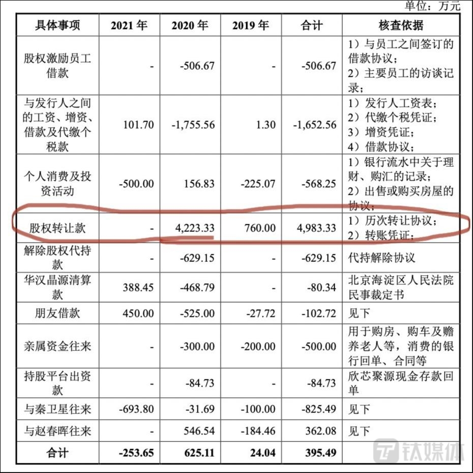 其次,据核查报告,张欣刚于2019年、2020年分别收到760万、4223万股权转让款,合计4983万,完全足够清偿早年对秦氏兄弟的借款;2018、2019两年,张欣刚还合计向赵春晖出借近800万。