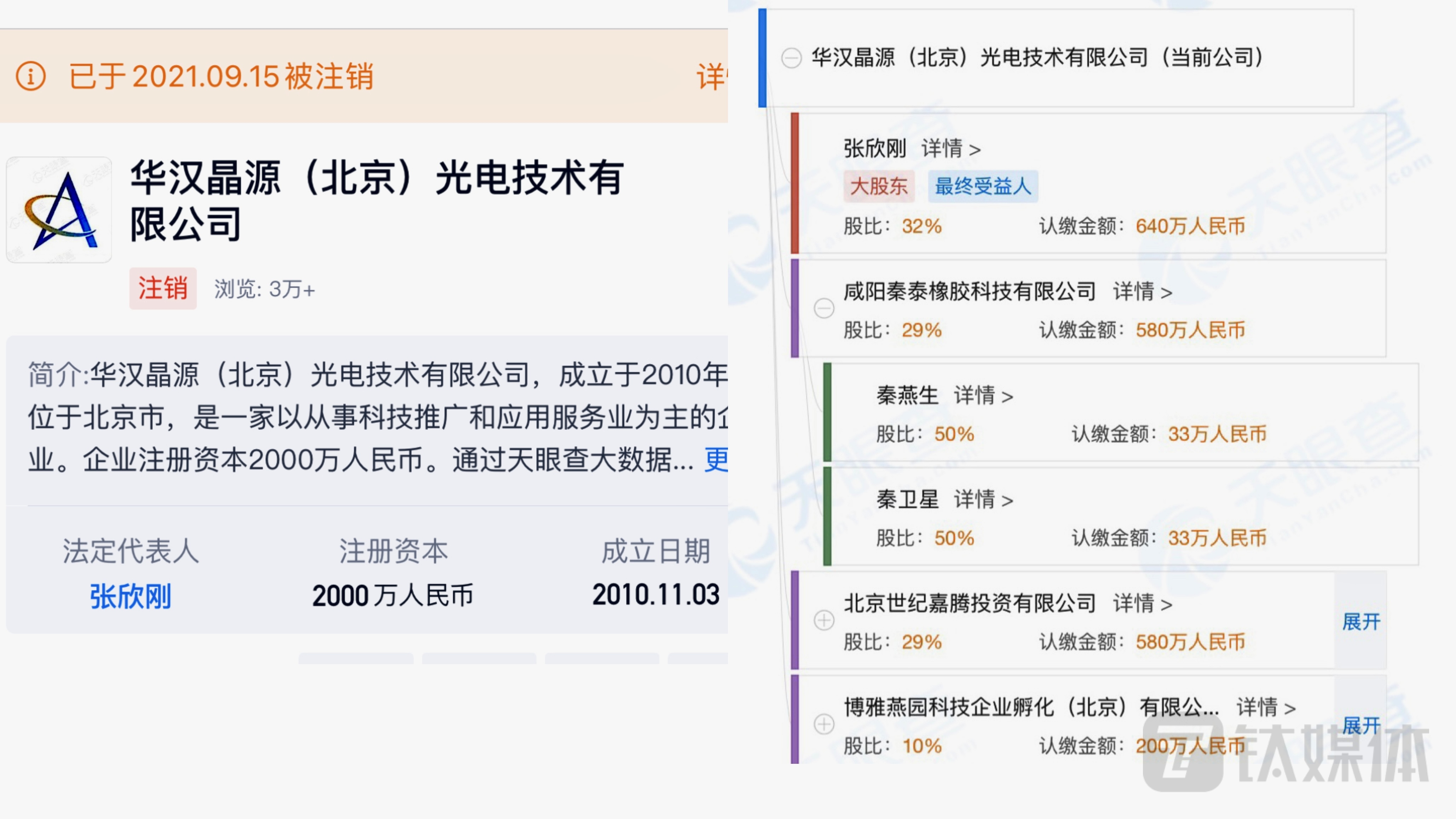 工商信息还显示,早在2010年11月,张欣刚与秦氏兄弟就已联合他人一起在北京创办企业。在这家名为华汉晶源(北京)光电技术有限公司(简称‘华汉晶源’)股东中,张欣刚为外籍自然人大股东、法人、董事长,秦氏兄弟以其名下咸阳秦泰橡胶科技有限公司位列二股东。