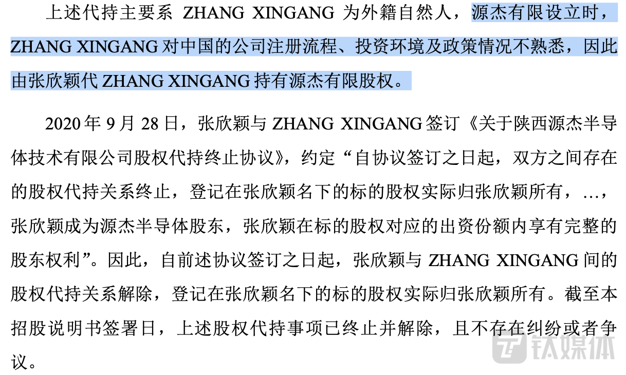 张欣刚则解释称:“源杰有限设立时,身为外籍自然人对中国的公司注册流程、投资环境及政策情况不熟悉,因此由张欣颖代持。”