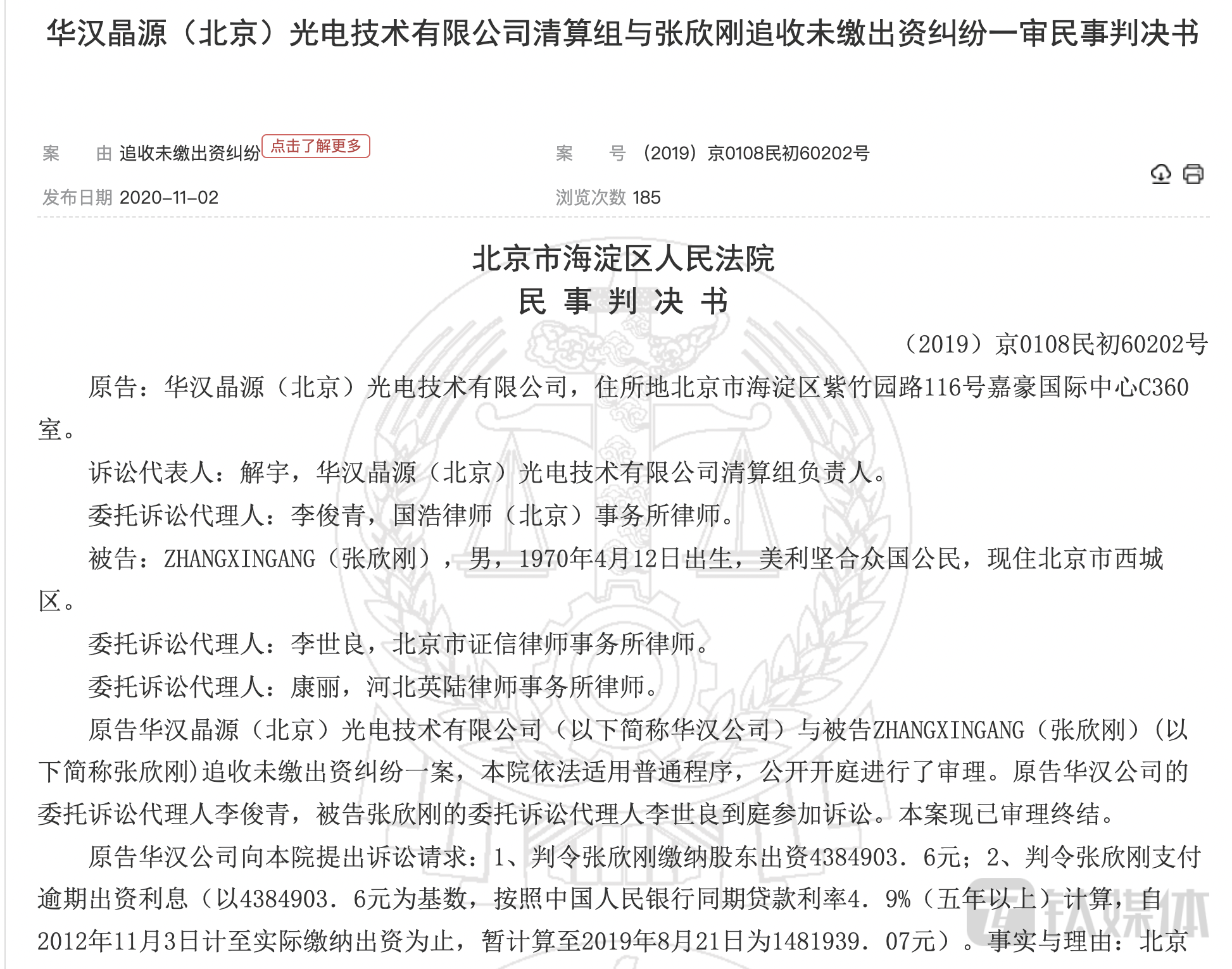 相关判决显示,华汉晶源公司设立时,初始三名股东都没有缴足出资。其中,张欣刚认缴出资640万人民币元,实缴约201万元,一直欠缴出资约438万元(出资期限为2012年11月2日);咸阳秦泰橡胶科技有限公司实缴200万,欠缴380万(后抵扣为欠缴280)。