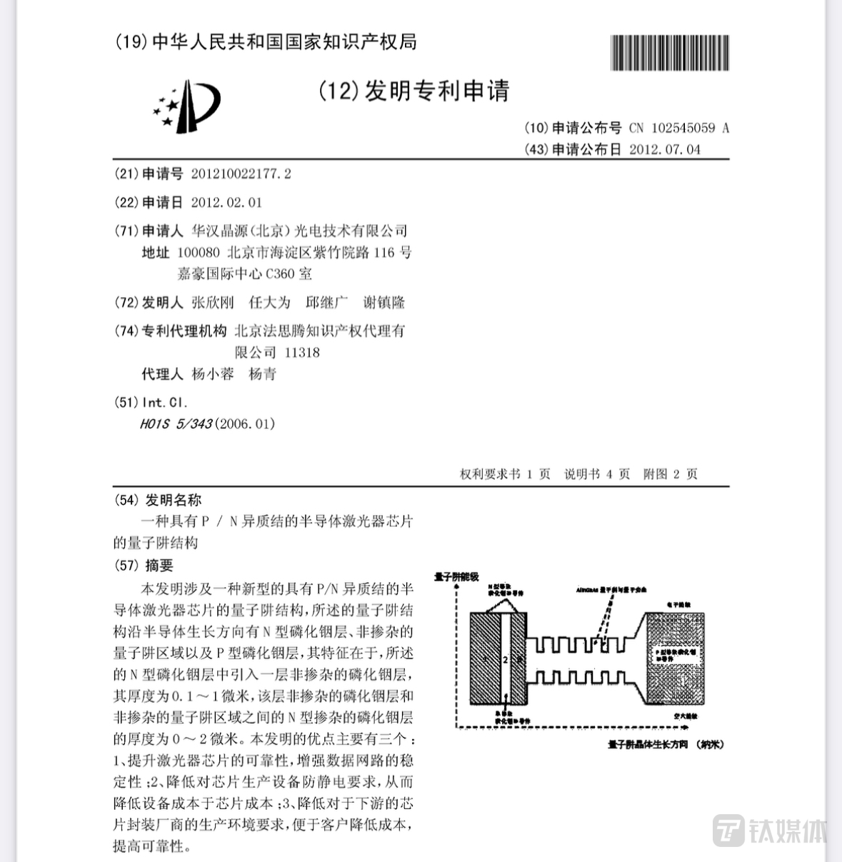 竞业禁止被突破最常引发的是专利纠纷。早年创办华汉晶源时,张欣刚作为第一发明人曾于2012年2月申请了一项发明专利(实质审查生效后因未有继续推进而被视为撤回);在源杰科技,张欣刚则彻底隐身技术岗,甚至未将自己认定为核心技术人员。