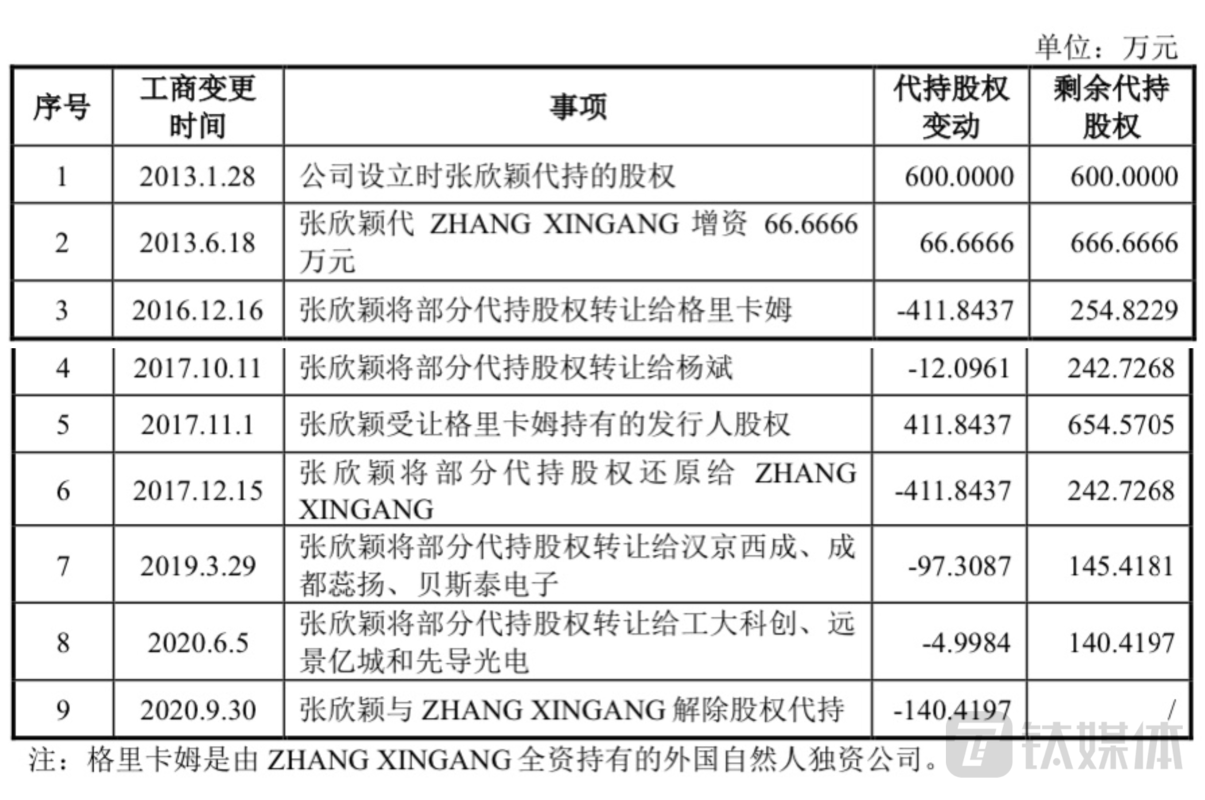 张欣刚被代持的共666.6666万元注册资本对应的股权,其中约411万股为显名还原,具体路径为:2016年10月,张欣刚在深圳设立格里卡姆电子技术(深圳)有限公司。公司性质为外商独资、一人公司,实缴注册资本500万人民币,外籍自然人股东显示为ZHANG XINGANG。