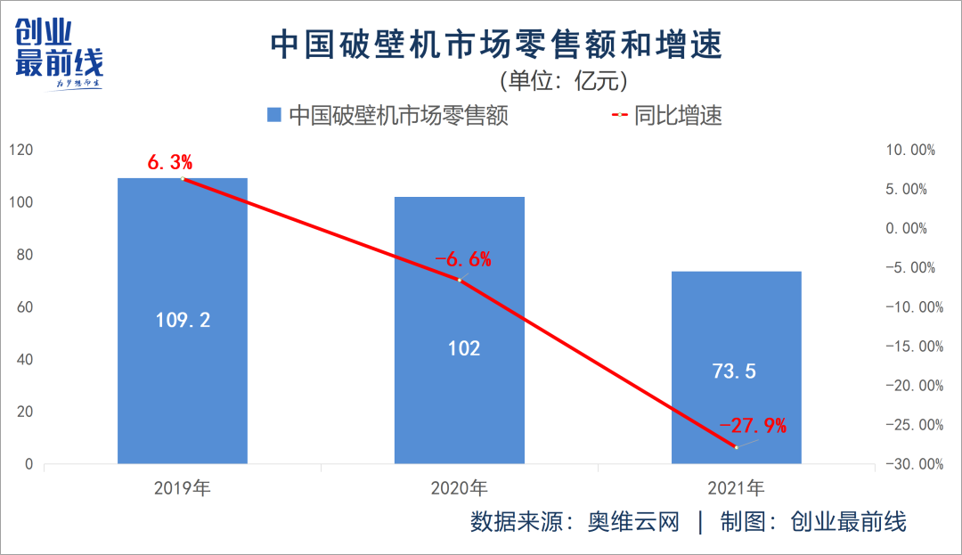 不过,此后的三年中国破壁机市场规模却呈逐年减少的态势。根据奥维云网数据,2019年、2020年和2021年国内破壁机市场零售额分别为109.2亿元、102亿元和73.5亿元。