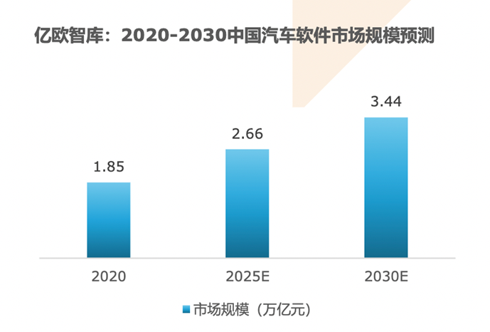 亿欧智库预计,随着软件的价值在汽车中被放大,2030年中国汽车软件市场规模将增长至3.44万亿元,年复合增长率为7%。软件在整车价值有望达到65%,将成为未来汽车行业最重要的领域。
