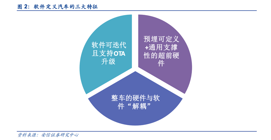 因此,可以将汽车行业一些新的特征归纳如下:整车的硬件与软件“解耦”、软件可迭代且支持OTA升级、预埋可定义加通用支撑性的超前硬件。