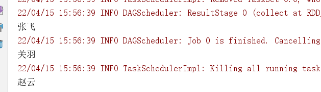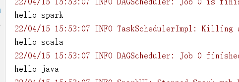 运行这段程序,从控制台可以看出,从集合中创建的RDD并打印出了各个元素