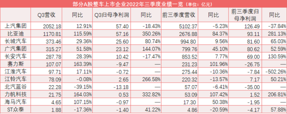 如果整体来看,A股上市整车企业12家,三季度营收最高的超过2000亿,最低不到2亿。上汽集团、比亚迪等在营收方面有明显优势,ST众泰、海马汽车等则在破产边缘。