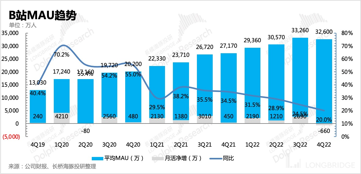 四季度 B 站的用户环比流失 660 万,整体月活(App、PC、电视等)3.26 亿人,同比增长 20%,可以说是首次不及预期。