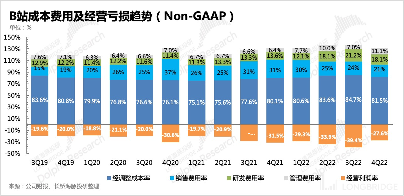 最终 Non-GAAP 下经营亏损 21 亿,亏损率 34%,剔除一次性后的真实亏损情况为 13 亿,-21%,短期比有优化,但是从 B 站自身的经营、现金流状况以及市场的预期来说,还得要加快。