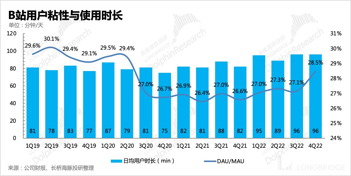 体现用户粘性的指标 DAU/MAU 提升至 28.5%,日均用户时长为 96 分钟。存量用户活跃度提升,应该是与 Story Mode 的渗透率提升不无关系。上季度达到 10 万粉的 Up 主,有一半是靠的 Story Mode 内容。